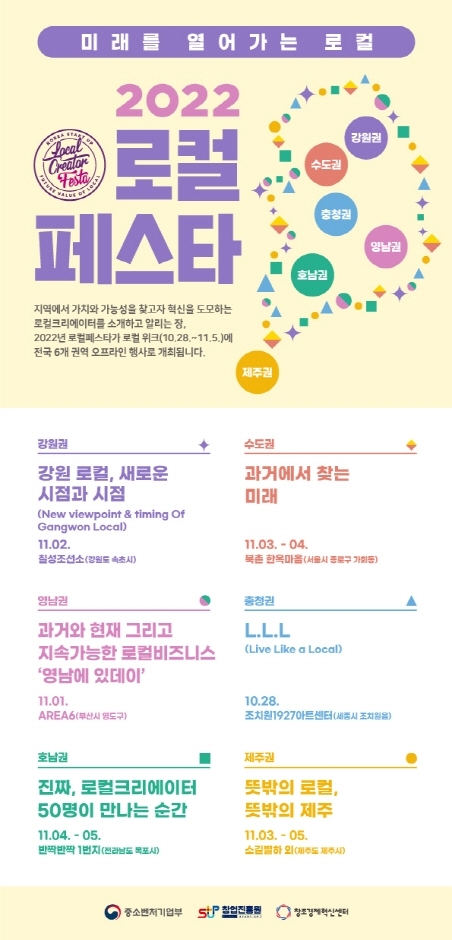 2022년 로컬페스타가 '미래를 열어가는 로컬'을 주제로 로컬 위크(10.28. ~ 11. 5.) 동안 전국 6개 권역(수도권/강원권/충청권/영남권/호남권/제주권)에서 오프라인 행사로 개최된다.