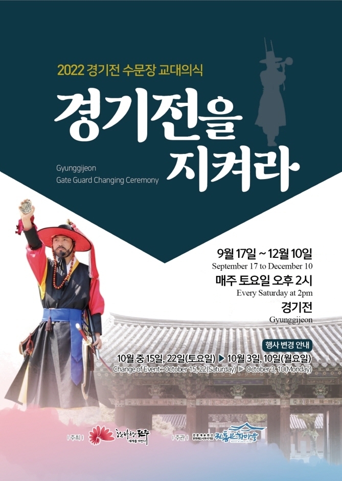 조선시대 왕궁을 수위하던 수문장의 교대의식을 참고하여 전주한옥마을 경기전 수문장 교대의식을 전주다움으로 새롭게 연출한 프로그램입니다. 조선왕조 발상지로서의 전주와 경기전의 역사적 상징성을 재조명하여 천년고도 전주시의 고유한 문화관광 프로그램으로 관광객 여러분과 함께 하고자 한다.