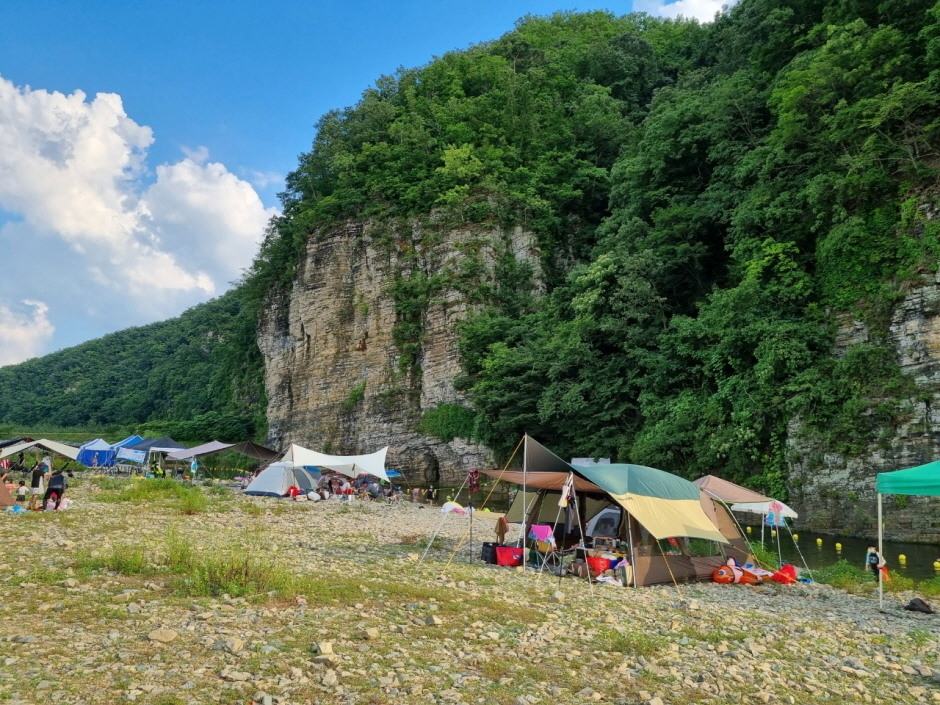 암석 절벽 앞으로 계곡물이 흐르고 계곡 앞에는 캠핑을 할 수 있는 넓은 공터가 있다.