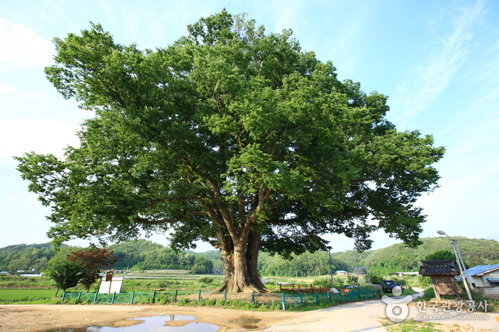 이 나무는 수령 약 600년이며 크기는 높이 28m, 가슴높이의 둘레 9.5m, 가지 밑의 높이 1.9m, 가지의 길이는 동쪽으로 16.8m, 서쪽으로 15.9m, 남쪽으로 15.9m 북쪽으로 12.8m인 느티나무이다. 마을의 정자목이며 크게 두개로 갈라져서 자랐다. 한쪽 큰 가지가 일제때 잘렸으며 주변이 통로로 되어 있어서 제대로 보호하기가 어렵다. 느티나무는 느릅나무과의 낙엽교목이다. 이 나무는 마을의 수호신처럼 믿고 있으며 정월 보름날에는 온 마을 사람들이 이 나무 밑에 모여서 새해의 행운과 풍작을 빌어 왔다.