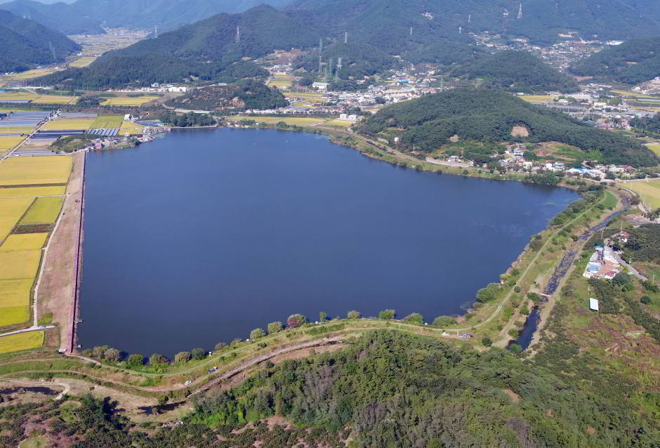 농업용수 공급을 위해 조성된 초동저수지. 그 둘레를 따라 마련된 데크길은 걷기 좋은 산책로로 점차 유명세를 더하고 있다. 둑 위로 이어지는 길에서부터 데크길까지 천천히 걸으면 1시간 정도가 소요되는 만큼, 건강한 산책을 즐기는 인근 주민들이 즐겨 찾는다. 계단길이 없고 경사가 평탄해서 남녀노소 누구나 가볍게 걷기 제격이다. 저수지 앞쪽 초동 쉼터에는 팔각정, 애향비와 나무들이 작은 공원처럼 꾸며져 있고, 주변에는 애견 동반 브런치 카페 등이 있어 아이들과 함께 찾기에도 좋다.
