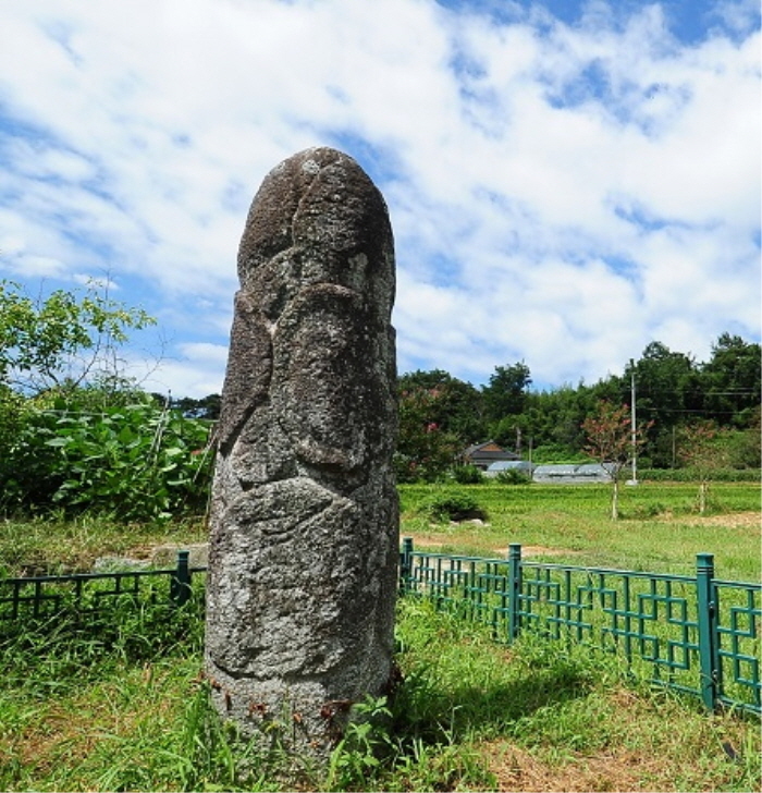 남근석은 남자 성기 모양으로 자연암석이나 암석을 조각하여 세운 것으로 복을 받거나 다산 풍농, 풍어를 기원하는 민간신앙의 대상이 되고 있다. 산동리마을 앞 당산나무 부근에 자리한 이 남근석은 화강암으로 정교하게 조각되었다. 생김새는 건장한 남성의 성기가 충분히 발기되어 있는 모양으로 아랫부분에 연꽃무늬가 조각되어 있는 점이 독특하다. 500여년전 여장사가 2기의 남근석을 차마에 싸가지고 오다가 무거워서 1기는 창덕리에 버리고 1기는 이곳에 세웠다는 이야기가 전해진다. 언제 세운 것인지는 정확히 알 수 없으나 다른 남근석에 비해 매우 섬세하게 조각되어 주목되는 작품이다.