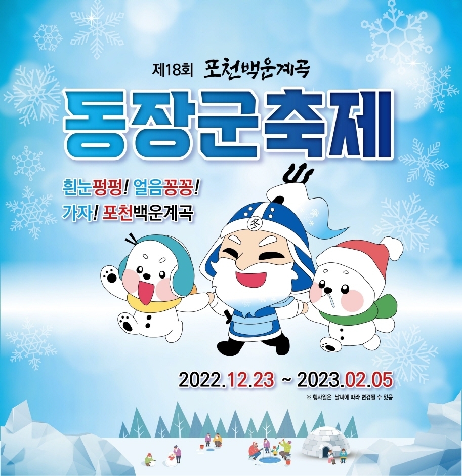 코로나19로 대부분의 지역축제가 취소되고 있다. 하지만 산과 계곡과 어우러져 경치가 아름다운 포천백운계곡네에서 현지마을 주민들이 손수 만들어 가는 제1회 백운계곡동장군나드리 란명으로 가자 포천으로! 달려라 동심으로!란 주제로 2022년 1월 7일~2월6일까지 30일간열려진다. 약3천평부지네 에서 이루어지는 축제는 겨울 여행의 테마가 있는 놀이와 먹거리 체험등 다양한 프로그램으로 진행되며. 특히 처음 선보이는 눈썰매장은 길이가 약 120m로 계곡과 주변 경관과 어우러져 눈썰매를 타며 전후 좌우 아름다운 경치를 감상 할 수 있어 그야말로 수도권 내에서 최고임을 자랑한다.
