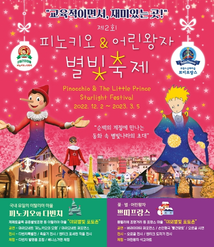 쁘띠프랑스&이탈리아마을 야외 곳곳에서 감상할 수 있는 별빛포토존을 새롭게 준비했다. 짙은 쪽빛 물감을 풀어 놓은 듯한 겨울 밤하늘 아래 프랑스와 이탈리아 밤거리를 모티브로 유럽에서 직접 공수한 전구와 LED를 사용해 연출된 조명은 유럽특유의 포근하면서도 사랑스러운 느낌으로 겨울밤의 낭만을 더할 예정이다.