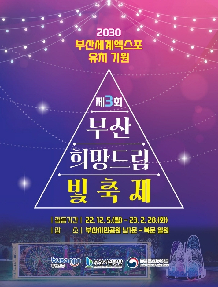 부산의 대표 도심공원인 부산시민공원에서 부산진구청, 부산시민공원, 부산국립국악원 3개 기관이 협력하여 제3회 부산 희망 드림 빛축제를 개최하였다. '부산의 꿈과 희망의 빛을 모아 세계로'라는 주제로 2030부산세계박람회 유치 기원 등 테마를 구성하여 다양한 빛 시설물과 함께 특색있는 볼거리를 제공한다.