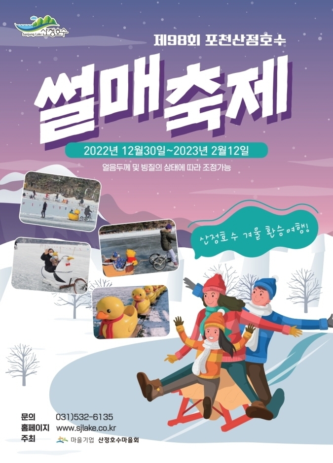 제98회 포천 산정호수 썰매축제는 마을주민이 직접 기획하고 운영하는 축제로 마을 주민들의 마음과 정성을 담아 방문하시는분들에게 특별한 추억을 만들어 드리고자 산정호수만의 겨울놀이로 추억의 얼음썰매,산정호수에서만 탈수 있는 오리썰매,펭귄썰매,푸우썰매,로맨스자전거,러버덕기차등 체험을 준비하였다. 가족, 연인, 친구와 함께 산정호수 풍경도 감상하고 체험을 통해 즐거운 추억을 만들어 가길 바란다.