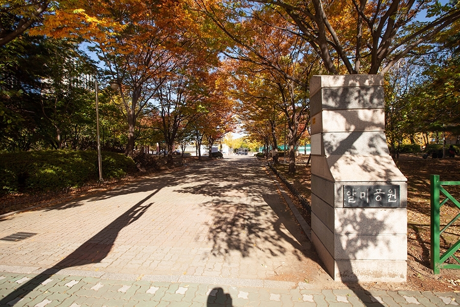 알미공원은 일산 백석역과 마두역 중간쯤에 있는 근린공원이다. 알미라는 이름은 일산 신도시가 만들어질 때 붙여졌는데, 신도시 개발 이전의 동네 이름을 따왔다. 소공원이라서 한적하게 산책하고 조용히 쉬기 좋다. 곳곳에 벤치가 마련되어 있고 체육 기구가 종류별로 설치되어 있어서 동네 주민들이 걷고 운동하기에도 적합한 공원이다. 공원 중앙쯤에 백석정이라는 정자가 있어서 여러 사람이 앉아 쉴 수 있고, 공연장도 설치되어 있다. 수령이 오래된 나무들이 잘 관리되어 있어서 아이와 함께 가을 나들이를 하거나 데이트하기에도 손색이 없다.