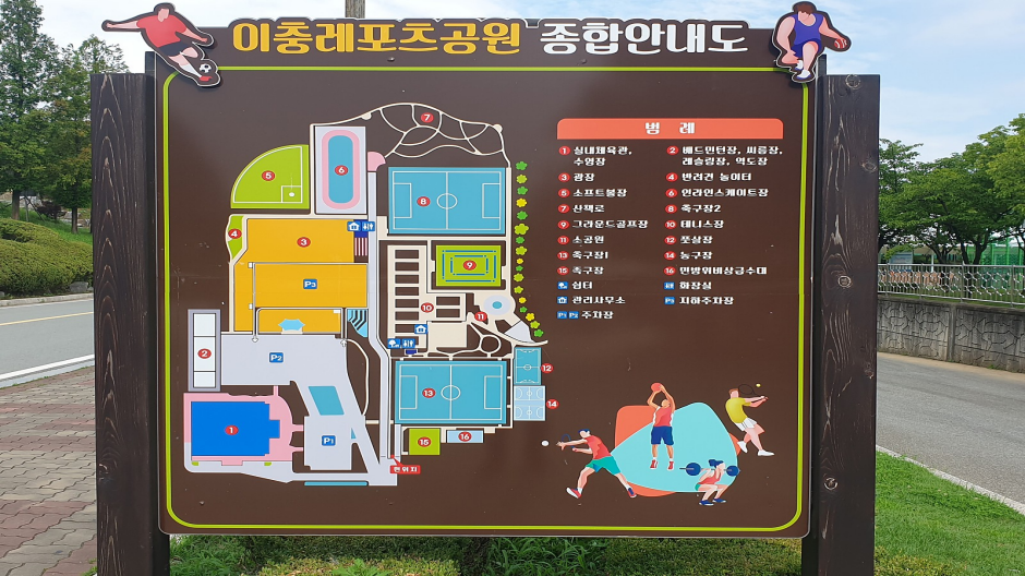 - 이용가능시설 : 축구장, 테니스장, 배드민턴장, 농구장, 풋살장, 족구장, 소프트볼장, 그라운드골프장, 인라인스케이트장, 역도장, 씨름장, 수영장 (이충문화체육센터 내부), 레슬링장