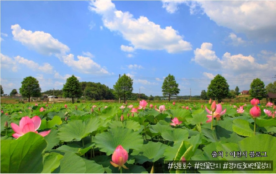 경기도 이천시 설성면 장천리 성호 호수에 있는 연꽃단지이다. 수 면적 약 320,000㎡의 넓은 성호 호수와 접해 있다. 2007년 이천시에서 연꽃단지를 조성하여 오랫동안 자라온 연잎이 6월이면 초록으로 자라기 시작하여 한여름에 절정을 이룬다. 파란 하늘과 흰 구름 분홍색 연꽃이 어우러져 사진작가들을 부르는 사진 명소이다. 한적한 시골길을 지나서 단지에 도착하면, 단지 가운데 놓인 테크길이 어서 오라고 손짓하는 듯하다. 파란 연잎 사이로 핀 연꽃을 보며 힐링하기 좋은 곳이다.