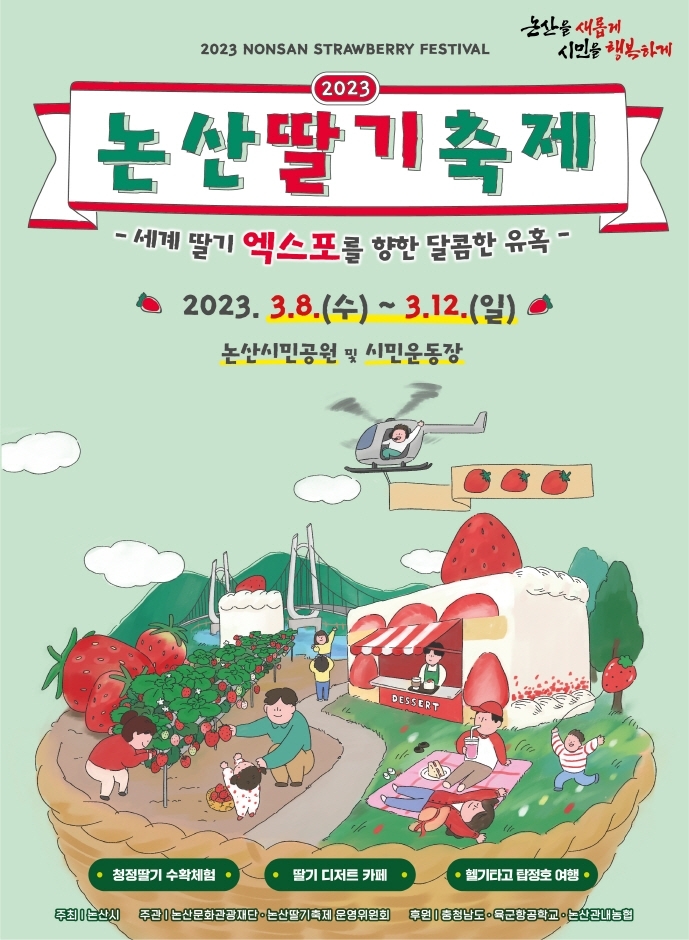올해 25회를 맞는 ‘2023논산딸기축제’는 코로나19 팬데믹 이후 4년 만에 대면 축제로 개최된다. ‘세계 딸기Expo를 향한 달콤한 유혹’을 주제로 펼쳐지는 이번 축제는 ‘청정딸기 수확 체험’, ‘딸기 디저트 카페’,‘상설 키즈존(키자니아 고!)’, ‘메타버스 현장 이벤트’ 등의 새롭고 다양한 프로그램을 선보인다. 특히 육군항공학교와 함께하는 ‘헬기타고 탑정호 여행’, ‘헬기 전시’ 체험 프로그램은 국방친화적인 논산의 특화 콘텐츠로 특별히 마련되어 먹거리, 볼거리, 즐길거리가 풍성한 축제로 기대를 모으고 있다.