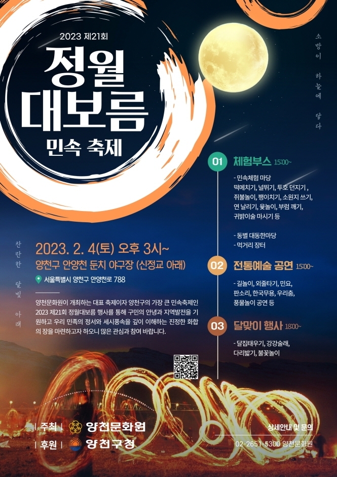 양천문화원 주최, 양천구청의 후원으로 개최되는 지역 대표 축제인 ‘2023 제21회 정월대보름 민속축제’가 오는 2월 4일(토) 오후 3시부터 양천구 안양천 야구장 일원에서 개최된다. 떡메치기, 널뛰기, 소원지 쓰기, 부럼깨기 등의 전통놀이 체험부스와 먹거리 장터가 열리며 외줄타기, 판소리, 한국무용, 풍물놀이 등의 공연으로 볼거리와 흥겨움을 더할 예정이다. 또한 보름달이 떠오르면 달집 태우기, 불꽃놀이 등의 성대한 달맞이 행사로 구민의 안녕과 희망찬 새해를 기원할 예정이다.