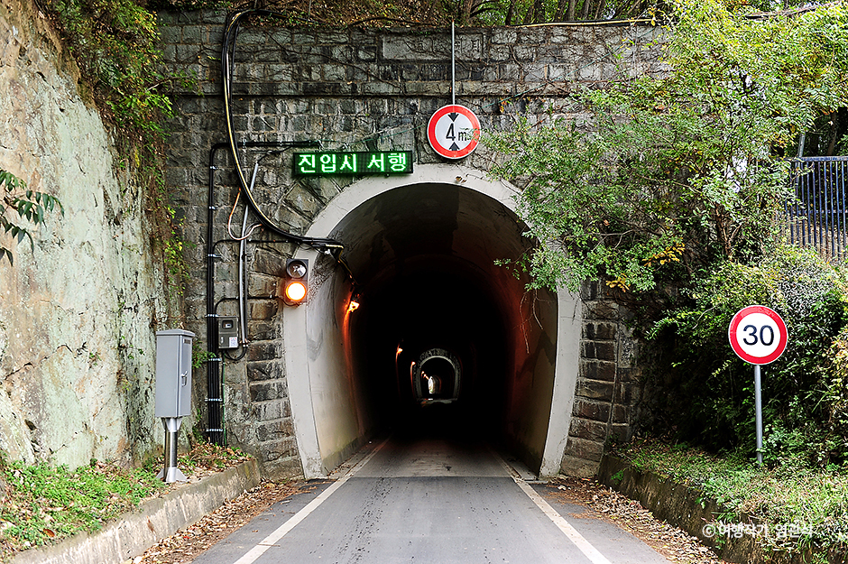 밀양 용평터널은 1905년 경부선 철로가 지나던 곳으로, 1940년 산 밑으로 새로 터널이 뚫리면서 더 이상 기차가 다니지 않게 되었다. 기차가 달리던 옛길에 지금은 자동차가 지나는데, 차 한 대만 겨우 지날 수 있을 만큼 폭이 좁아서 터널을 통과하려면 반대쪽 진입 차량을 반드시 확인해야 한다. 안전을 위해 입구에 진입 차량 통제시스템 신호가 제공된다. 약 300m의 짧은 터널이지만 오랜 시간이 고스란히 묻어나는 이색 드라이브 코스로 인기를 끌고 있다. 또 차량 통행이 많지 않은 편이라 터널 내부에서 사진 촬영도 가능하다. 특히 SNS에서 화제를 모으는 포토존은 터널 가운데 오픈된 공간으로, 세월의 흔적을 품은 터널과 하늘을 가릴 만큼 울창한 나무가 신비로운 분위기마저 풍긴다.
