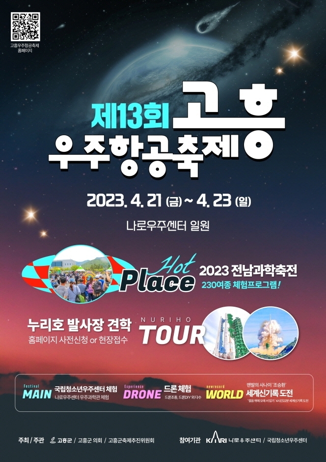 2023년 제13회 우주항공축제는 나로우주센터가 지구 밖 우주로 가는 유일한 플랫폼이고, 별*난 우주과학 스토리가 쏟아지는 우주여행 고흥에 오실걸 환영한다는 의미로 "별*난 우주여행 Welcome to 고흥"이라는 슬로건으로 나로우주센터 우주과학관 잔디 광장 일원에서 개최된다. 축제 컨셉은 빅뱅 1부터 빅뱅 4까지로 빅뱅 1의 주테마는 스페이스 플랫폼으로 누리호 발사장 견학과 빅뱅 2의 주테마는 스페이스 뮤지엄으로 나로우주센터 우주과학관 98종 체험과, 국립청소년우주센터의 1인승 우주선 조종체험, 천체투영, 4D시뮬레이션, 폼로켓제작발사 등 다양한 콘텐츠로 구성하였고, 빅뱅 3의 테마는 별*별 과학체험으로 전남과학축전과 병행하여 창의융합 과학체험 , 우주&천체 체험, 메타버스 융합체험 등 130여종의 신비한 과학체험 프로그램을 운영한다. 또한, 드론 체험, 버스킹, 학생 댄스경연대회, 분청사기 만들기 체험 등 다양한 프로그램이 운영된다.