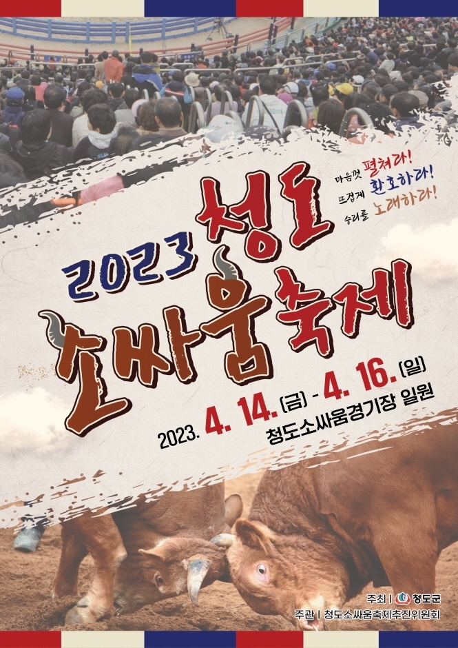 <2023 청도소싸움축제>는 4월 14일부터 16일까지 청도소싸움경기장 일원에서 열린다. 천년의 역사를 이어 내려온 청도소싸움은 이제 청도의 대표적인 민속행사로, 한국농경문화를 대표하는 문화축제로, 더 나아가 전 세계의 주목을 받는 세계적인 축제의 장으로 거듭나고 있다. 박빙의 승부로 관중들을 흥분의 도가니로 몰아넣는 민속소싸움경기와 박진감 넘치는 로데오경기, 지축을 울리는 함성과 뜨거운 축제의 현장을 체험할 수 있다. 청도소싸움축제는 현재 청도군을 대표하는 축제로 자리매김하였다.