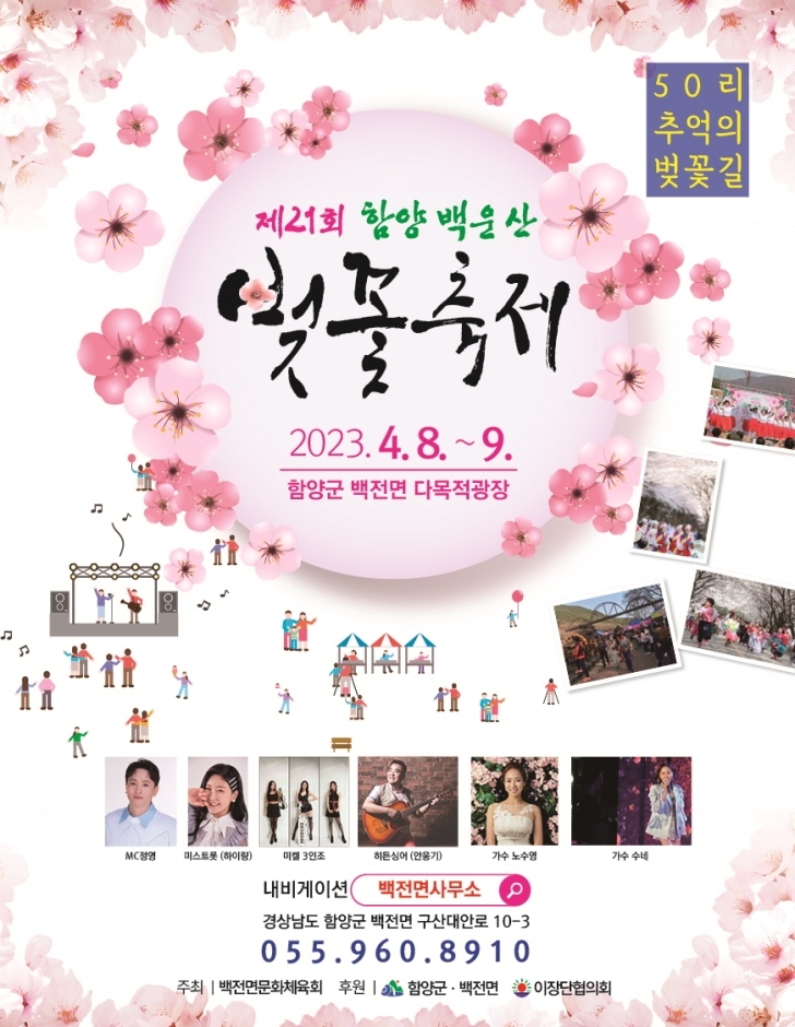 2023년 제21회 함양 백운산 벚꽃축제는 오는 4.8(토)부터 4.9(일)까지 이틀간 진행된다.