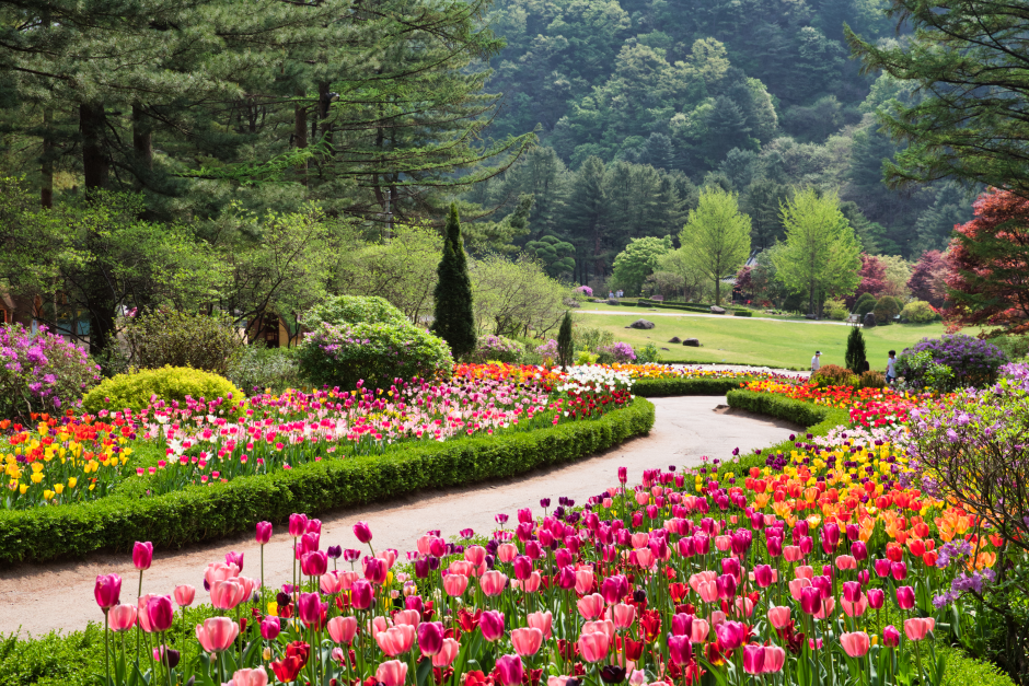 봄볕에 반짝이는 땅과 신록으로 물든 아침고요수목원은 축령산의 빼어난 산세와 어우러져 그림 같은 풍경을 자아낸다. 튤립, 철쭉, 수선화 등 봄꽃 군락을 중심으로 목련, 진달래, 매화, 개나리, 벚꽃 등 다양한 봄꽃들이 가득 피어난 황홀한 모습을 감상할 수 있다.
