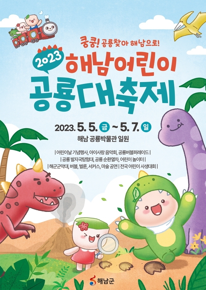 어린이날을 맞이하여 온 가족이 함께 즐길 수 있는 공룡대축제가 오는 2023년 5월 5일부터 7일까지 3일간 해남 공룡박물관 일원에서 펼쳐진다.