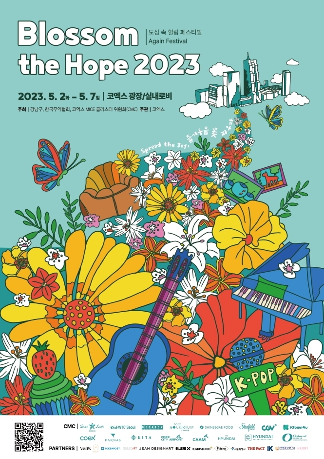 5월 2일부터 7일까지 서울 무역센터 일대에서 'BLOSSOM THE HOPE 2023'가 개최된다. 이번 BLOSSOM THE HOPE 2023는 'Spread the JOY : 즐거움을 꽃 피우다'라는 주제로 일상 속 지친 사람들을 전시, 공연 등 다양한 콘텐츠를 관람하며 힐링과 즐거움을 받아갈 수 있는 축제이다. 다양한 전시 외에도 뮤직 페스티벌, 푸드 스트리트를 통해 즐거움과 전시장 곳곳마다 마련된 포토부스로 잊지 못할 추억을 남길 수 있다. 이외에도 현장 안내데스크에서 이벤트 및 전시 소개 등의 서비스를 받을 수 있다.