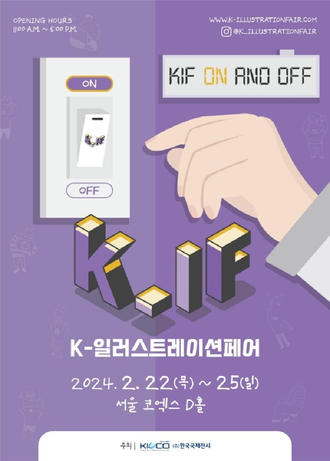 'K-일러스트레이션페어 서울 2024' 행사는 2024년 2월 22일(목)~25일(일) 4일간 코엑스 3층 D홀에서 'KIF On and Off(킾온앤옾)'이라는 주제로 펼쳐진다. 온라인과 오프라인을 넘나들며 일러스트레이션 산업은 영화, 음악, 패션 등 모든 문화 예술계 뿐만 아니라 각종 브랜드 마케팅 수단으로도 활용되며 넓은 분야에서 성장하고 있다. 'K-일러스트레이션페어'에서는 하나의 필수 산업으로 자리 잡은 일러스트레이션 산업의 트렌드를 조망하고, 다양한 작가들이 그려내는 다양한 세계관과 작품들을 만나볼 수 있다.
