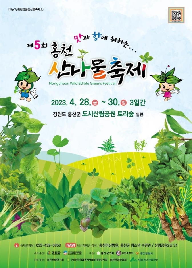 이번 제5회 홍천산나물축제는 4월 28일부터 30일까지 3일까지 도시산림공원 토리숲에서 개최되며 다양한 산나물 판매는 물론 품바공연, 산나물관련 이벤트와 무대공연, 다양한 먹거리로 관광객들을 맞이할 예정이다.