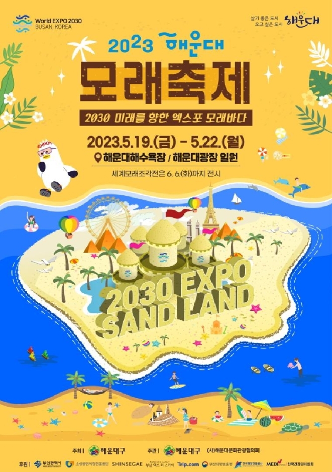 전국 최대의 모래를 소재로 한 친환경 전시회인 '2023 해운대 모래축제'가 2030 미래를 향한 엑스포 모래바다라는 주제로 2023년 5월 19일(금)부터 5월 22일(월)까지 해운대해수욕장 및 해운대 광장(구남로)에서 개최된다. 2030 월드엑스포 유치의 염원을 담은 모래 작품들과 화훼농가돕기 꽃 전시회를 비롯한 다양한 프로그램이 운영되며 모래작품과 꽃 전시는 6월6일(화)까지 운영된다.