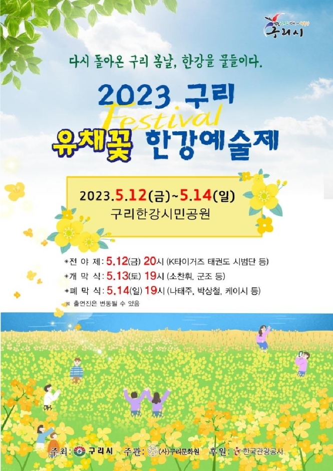 2023.5.12~14일까지 구리한강시민공원에서 '2023 구리 유채꽃 한강예술제'가 열린다.