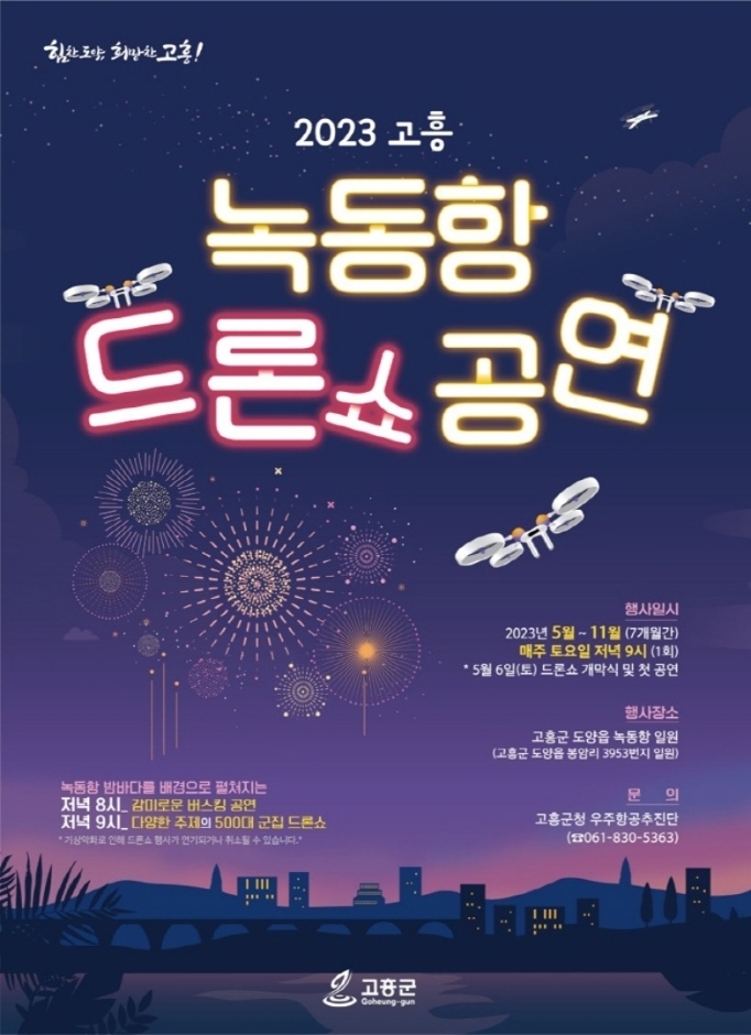 2023 고흥 녹동항 드론쇼, 매주 토요일 저녁 다채로운 콘텐츠로 고흥 녹동항 밤하늘을 화려하게 장식한다. 천혜의 자연경관과 함께 고흥 녹동항의 밤하늘을 아름답게 물들일 500대의 드론쇼, 매주 토요일마다 고흥을 찾아주시는 관람객들에게 잊지 못할 추억을 선사한다.