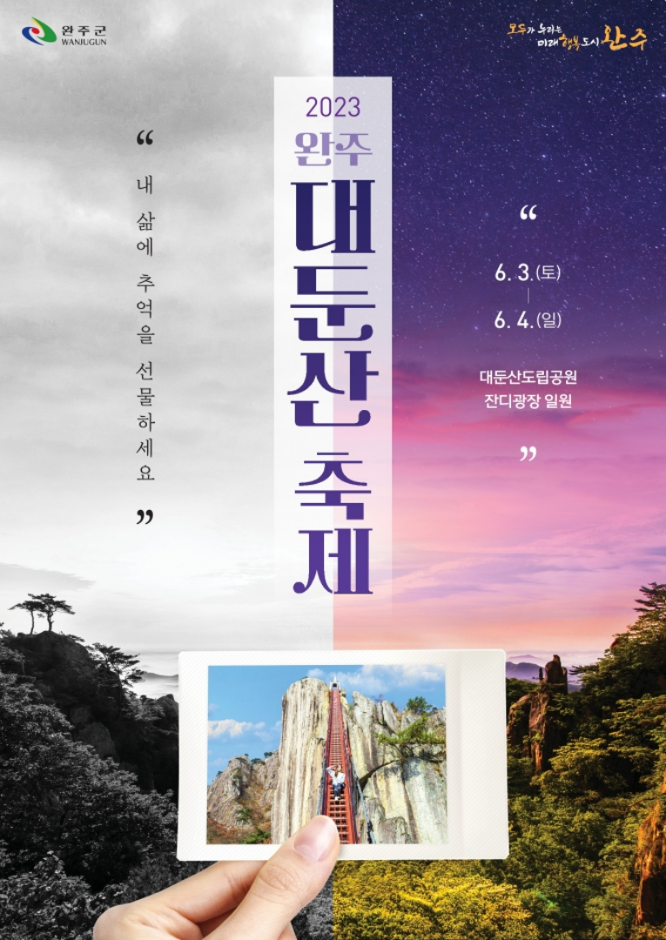 2023 완주 대둔산 축제는 전북 최초 산악축제로써 '내 삶에 추억을 선물하세요'라는 슬로건으로 6월3일부터 4일까지 양일간 모든 세대가 함께 추억을 만들 수 있는 축제로 열린다.