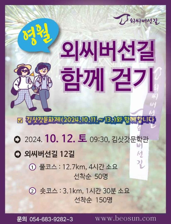 영월 김삿갓문화제 기간에 열리는 '외씨버선길 영월 함께걷기' 행사이다. 계곡을 따라서 난 외씨버선길 12길 김삿갓문학길을 걸으며 가을을 즐길 수 있다. 트레킹을 마치고는 문화제를 둘러보고 문학관에 들어가 난고 김삿갓에 대해 알아보자.