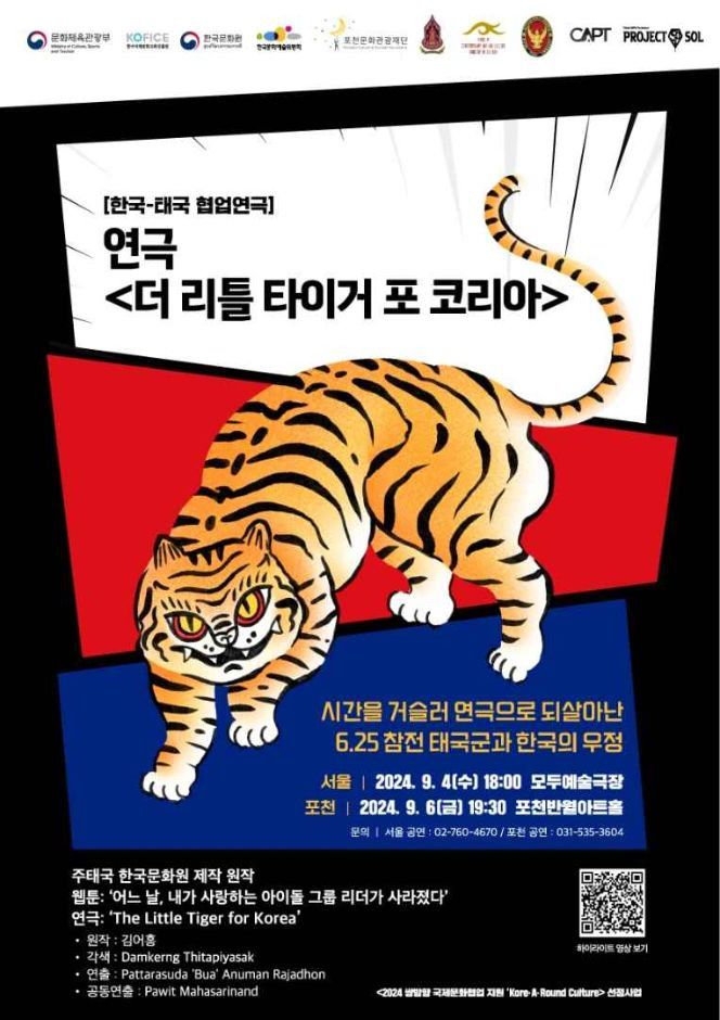 연극 <더 리틀 타이거 포 코리아 (The Little Tiger for Korea)>는 주태국 한국문화원 설립 10주년 및 한-태국 수교 65주년을 맞아 한국과 태국 예술인들의 협업을 통해 탄생했다. 태국인 참전용사의 후손인 주인공 핌이 사라진 케이팝 아이돌 케이를 찾기 위해 한국전쟁 당시로 시간 여행을 떠나는 이야기로, 태국의 웹툰 ‘어느 날, 내가 사랑하는 아이돌그룹 리더가 사라졌다’(원제: ‘One Day, My Favorite K-Pop Idol Group Leader Disappeared’)를 원작으로 한다. 이 작품은 한국전쟁에서 용맹했던 모습으로 ‘리틀 타이거’라고 불린 태국군 참전용사의 이야기를 통해 양국 간의 오랜 역사를 기억하고 우정을 다지기 위해 태국과 한국 양국에서 공연하게 되었다. 태국 연극인과 한국 전통음악가가 협업하는 이번 공동제작 연극은 문화체육관광부, 한국국제문화교류진흥원의 <2024 쌍방향 국제문화협업 지원> 사업의 지원으로 제작되었다.