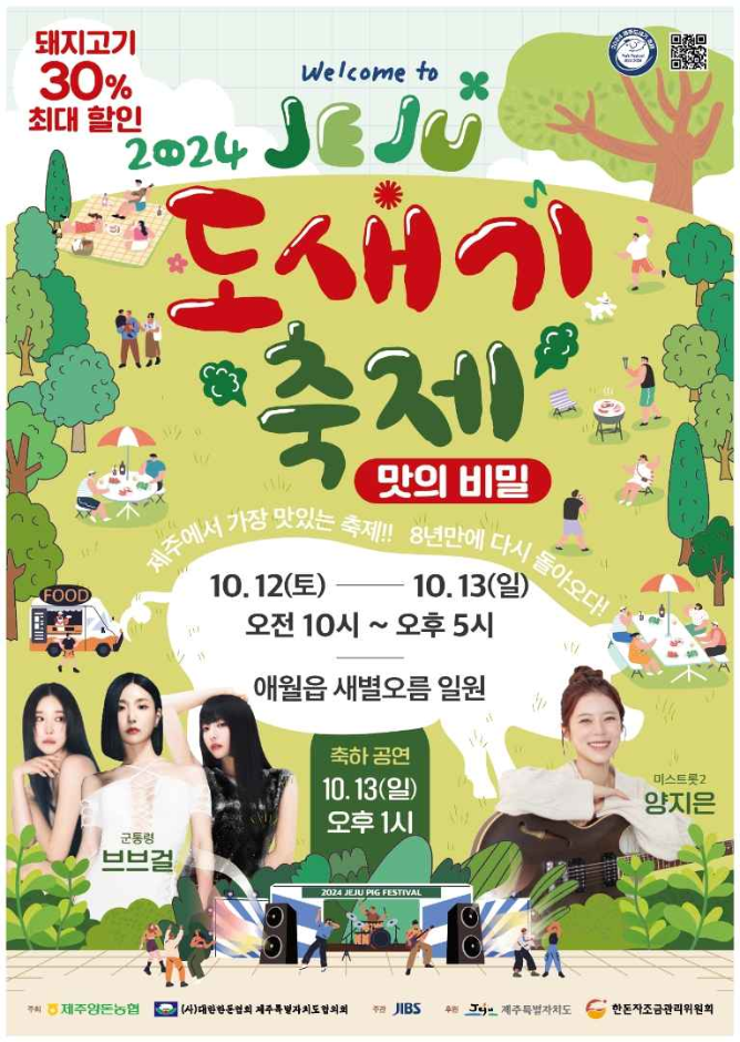 제주에서 가장 맛있는 축제 2024 제주 도새기 축제가 8년만에 다시 돌아온다. 믿을 수 있는 제주산 돼지고기와 누구나 즐길 수 있는 풍성한 즐길거리, 먹거리, 체험행사가 10월 12일(토), ~ 13일(일), 오전 10시 ~ 오후 5시까지 제주 새별오름 일원에서 펼쳐진다. 시중가 보다 최대 30%저렴한 소비촉진 행사와 가수 양지은, 가수 브브걸의 화려한 축하공연 등 다양하고 다채로운 프로그램이 진행된다.