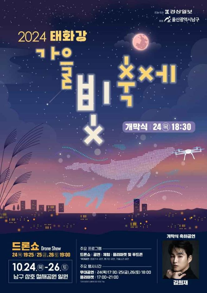 2024 태화강 가을빛 축제가 10월 24일 목요일부터 26일 토요일까지 울산 남구 삼호철새공원 일원에서 개최될 예정이다. 이번 축제는 화려한 드론쇼와 함께 시작될 예정이며, 유명 가수 김희재가 개막 축하공연을 펼쳐 많은 이들의 기대를 모으고 있다. 드론쇼는 개막식이 열리는 24일 오후 7시 25분을 시작으로, 25일 금요일 오후 7시, 26일 토요일 오후 7시에 각각 진행될 계획이다.