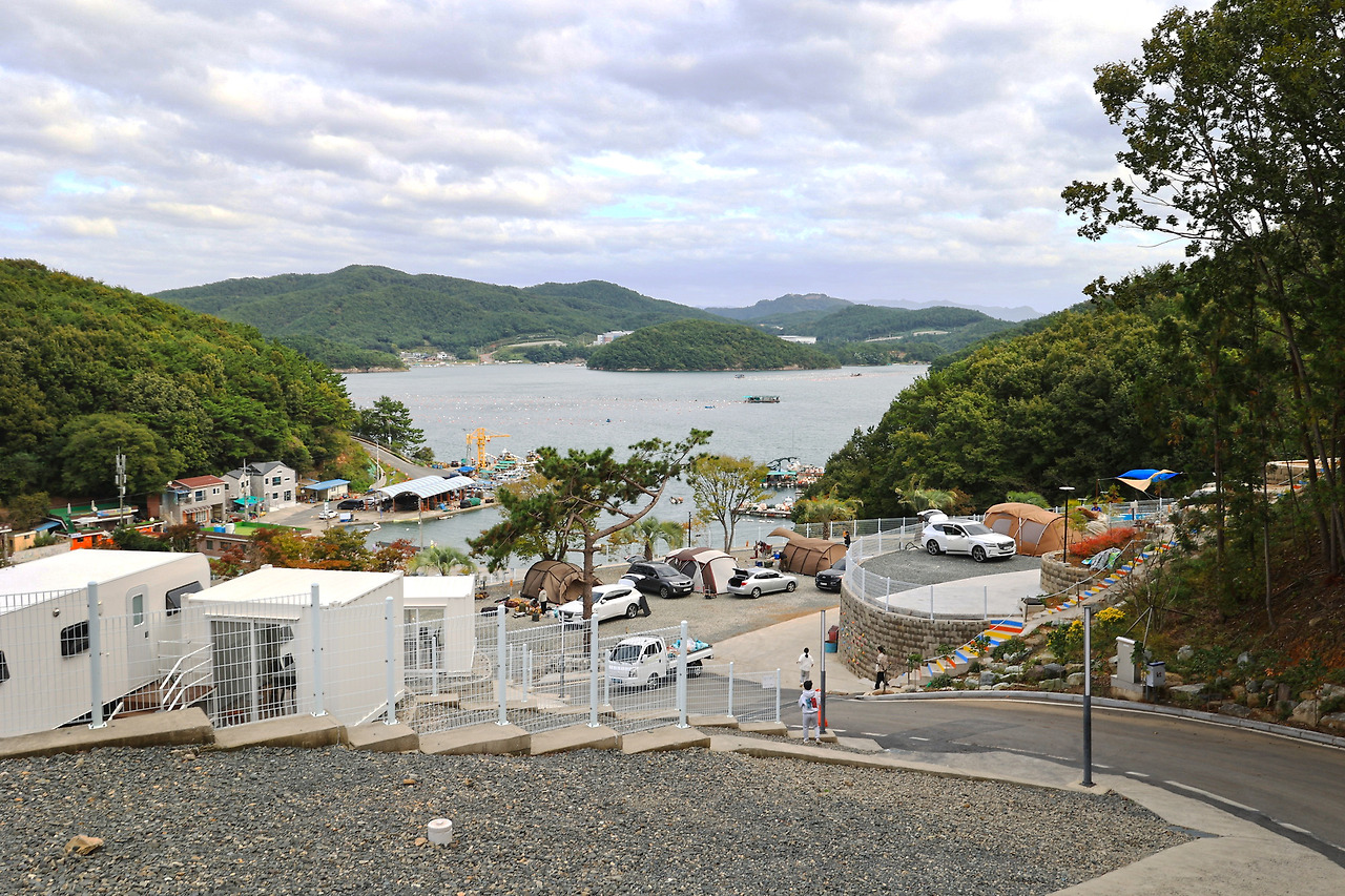 남해안에서 가장 아름답다는 창원 저도에 있다. 콰이강의 다리로 불리는 저도 연육교를 지나 오른쪽 해안을 따라가면 작은 항구위 언덕에 캠핑장이 크게 보인다. 산 허리를 계단식으로 만들어 모든 사이트와 카라반에서 바다를 내려다 볼 수 있다.
