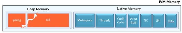 (image) JVM 메모리 구조 개요: 왼쪽 주황색 영역이 힙(Heap Young/Old 세대)이며, 오른쪽 파란색 영역들이 네이티브 메모리(Metaspace, Threads, GC, Direct Buff 등) 영역을 나타냅니다. OutOfMemoryError는 힙 메모리가 부족한 경우뿐 아니라 메타스페이스나 스레드처럼 네이티브 메모리 영역이 부족한 경우에도 발생할 수 있습니다. 따라서 애플리케이션 특성에 맞게 적절한 메모리 영역 크기를 설정하고, 모니터링을 통해 이상 징후를 조기에 발견하는 것이 중요합니다. (Understand the OutOfMemoryError Exception) (OutOfMemoryError: Types, Causes, and Solutions)