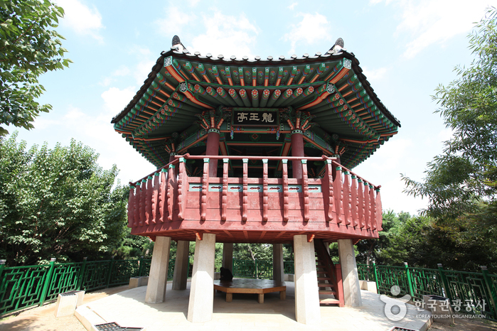 용왕정은 서울 정도 600년(1394~1994년)을 기념하여 1994년에 지어진 팔각형 정자로 조선조 중기 건축형태로 건립하였다.정자에 올라가면 서울시내를 조망할 수 있는 전망이 뛰어난 곳으로 서울 8경에 뽑힌 명소이다. 용왕정이 있는 용왕산은 일명 엄지산이라고도 하며 지형적으로 \'천호지벌\'(인공폭포 건너편)의 초입되는 곳에 있다. "임금이 꿈에서 누군가 자신을 해치는 꿈을 꾸었다. 왕은 엄지산 아랫마을에 사는 영험한 힘을 가진 박씨 노인이 죽어서 용으로 변신한 뒤 왕이 되려하는 것을 알고는 화살로 용을 쏘아 죽였다." 왕에 얽힌 이 고사 때문에 왕을 상징하는 용(龍)자와 왕(王)자를 합쳐 용왕산으로 불리기 시작했다고 한다.
