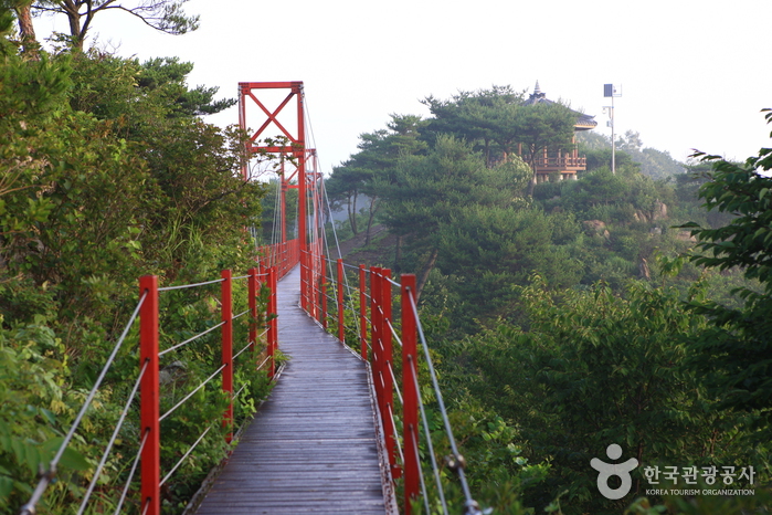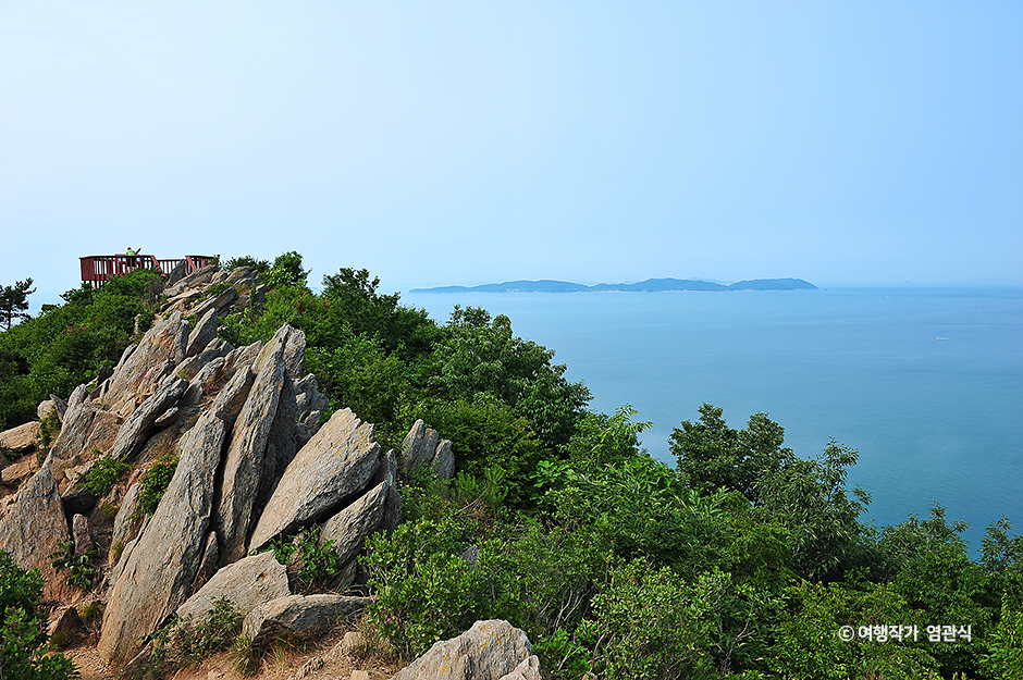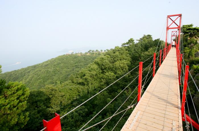 대이작도에는 산 두 개가 봉긋 솟아 있다. 부아산과 송이산이다. 200m도 넘지 않는 두 산 중에 대이작도의 명물인 빨간 구름다리가 있고 전망이 더 좋은 부아산에 많이 오른다. 해발 159m 높이의 부아산(負兒山) 정상이 멀리서 보면 어머니가 아이를 업은 듯한 형상을 하고 있어서 이 같은 이름이 붙었다고 한다. 정상에 오르다 보면 능선에 나무데크와 정자 형태의 전망대가 있어서 잠시 다리쉼을 할 수 있다.