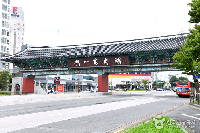 전주IC 인근에 있는 호남제일문은 길이 43m, 폭 3.5m, 높이 12.4m의 규모를 자랑하는 국내에서 가장 큰 일주문이다. 전주의 지역 특색과도 잘 어울리는 한옥으로 지어졌으며, 8차선 도로를 가로지르는 육교의 역할도 겸하고 있다. 전주로 진입하는 차들이 가장 먼저 만나게 되는 일주문으로, 湖南 第一門(호남 제일문)이라는 큼직한 글자가 눈에 띄는데, 강암 송성용 선생이 직접 쓴 글자이다. 호남지역 제1의 문이라는 의미와도 어울리게 웅장하고 화려하여, 전주를 방문하는 여행객들에게는 색다른 볼거리를 제공한다.