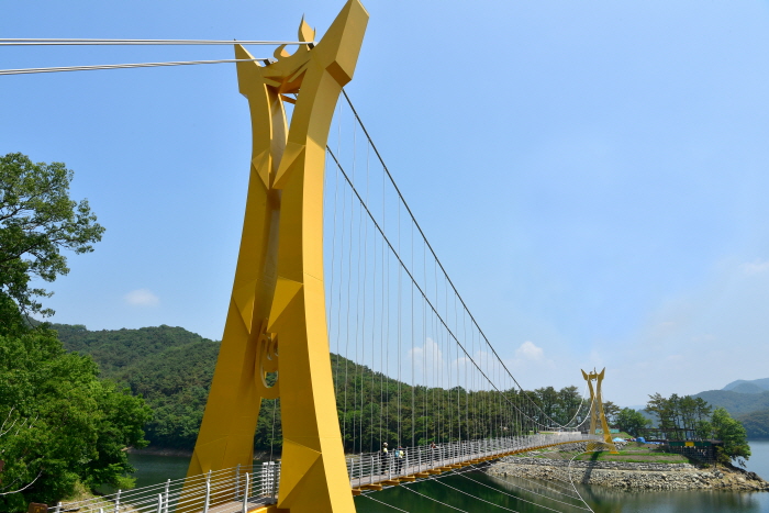 장성호 수변 길에 자리한 황금빛 출렁다리는 맑은 하늘과 녹음이 우거진 산, 그리고 장성호가 어우러진 풍경 속에 2020년 6월에 개통했다. 총 길이 154m로 옐로우 출렁다리와 길이는 같지만, 폭이 1.8m로 30cm 더 넓어 흔들림이 덜한 편이다. 흔들림이 덜해 줄을 잡지 않고도 건널 수 있다. 장성호 수변 길을 걷다보면 옐로우 출렁다리와 스카이 전망대를 지나 황금빛 출렁다리를 만난다. 다리를 건너다 보면 무주탑 방식으로 중앙부가 수면과 좀 더 가까이 있어 자연을 만끽하는 짜릿함을 느낄 수 있다.