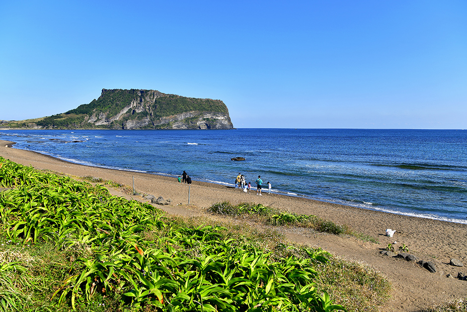 해발 180m인 성산 일출봉은 약 5,000년 전 제주도 수많은 분화구 중에서는 드물게 바닷속에서 수중폭발한 화산체이다. 용암이 물에 섞일 때 일어나는 폭발로 용암은 고운 화산재로 부서져 분화구 둘레에 원뿔형으로 쌓여 있다. 원래는 화산섬이었지만 신양해수욕장 쪽 땅과 섬 사이에 모래와 자갈이 쌓여 육지와 연결이 된 것이다. 일출봉 정상에는 지름 600m, 바닥면의 높이 해발 90m에 면적이 214,400㎡(성산일출봉 분화구의 면적)나 되는 분화구가 자리한다. 이곳에서 이장호 감독의 영화 \'공포의 외인구단\'의 한 장면이 촬영되기도 했다. 농사를 짓기도 했는데 지금은 억새밭을 이루며 우도가 손에 잡힐 듯 보인다.