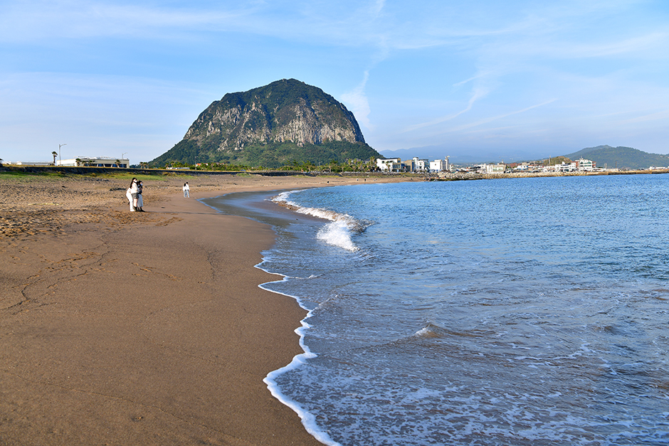 해발 180m인 성산 일출봉은 약 5,000년 전 제주도 수많은 분화구 중에서는 드물게 바닷속에서 수중폭발한 화산체이다. 용암이 물에 섞일 때 일어나는 폭발로 용암은 고운 화산재로 부서져 분화구 둘레에 원뿔형으로 쌓여 있다. 원래는 화산섬이었지만 신양해수욕장 쪽 땅과 섬 사이에 모래와 자갈이 쌓여 육지와 연결이 된 것이다. 일출봉 정상에는 지름 600m, 바닥면의 높이 해발 90m에 면적이 214,400㎡(성산일출봉 분화구의 면적)나 되는 분화구가 자리한다. 이곳에서 이장호 감독의 영화 \'공포의 외인구단\'의 한 장면이 촬영되기도 했다. 농사를 짓기도 했는데 지금은 억새밭을 이루며 우도가 손에 잡힐 듯 보인다.