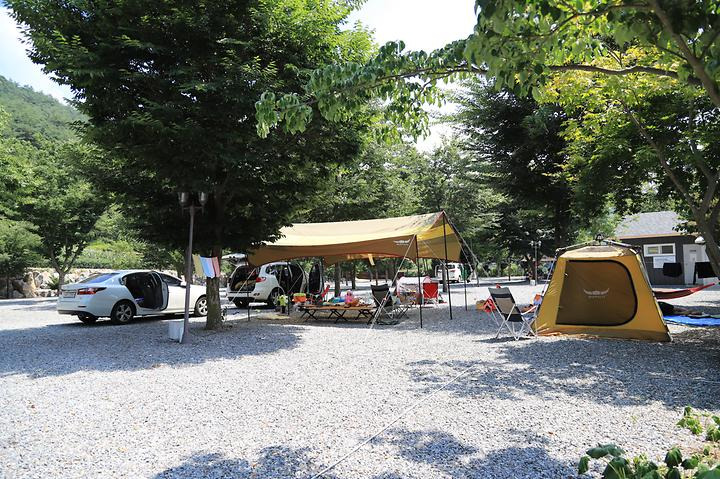 법흥계곡이 흐르고 울창한 나무그늘이 있는 캠핑장