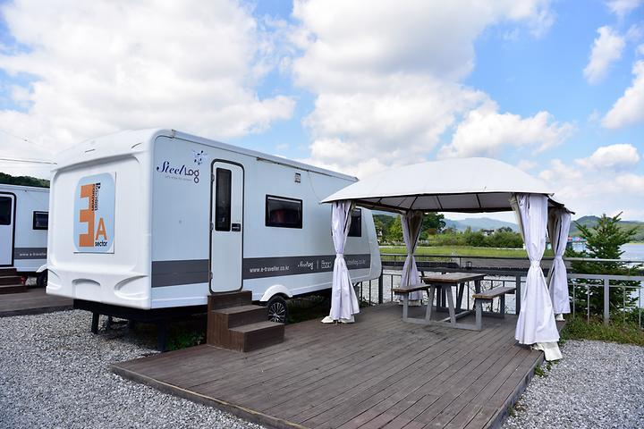 카라반 19대를 운영 중이며 서바이벌 그라운드가 접한 전망이 좋은 곳과 수상레저를 접근하기 쉽도록 바로 앞 호수가 인접한 곳에 위치하여 문을 열면 청평호의 시원한 풍경이 조망된다. 카라반은 파쇄석 위에 전용 나무데크 시설과 잔디밭위에 위치해 있어 꼭 외국 캠핑장에 와 있는 것 같은 느낌을 준다. 탁자와 의자가 있어 바비큐 그릴을 사용하기 편리하다. 공동 바비큐장도 이용이 가능하며 카라반 내 화장실과 샤워실 내부의 청소상태 또한 청경하여 이용객의 기분을 좋게 한다. 수상레저 전문업체가 운영하는 만큼 여름철 각종 수랑레저 및 액티비티를 체험 할 수 있으며 카바나식 그늘막이 설치된 수영장에는 일몰시 아름다운 사진을 남길 수 있다.