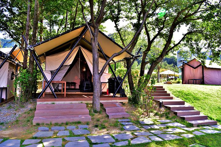 - 특징 : 청평의 아름다운 자연을 벗삼아 바비큐 메뉴를 즐기며 가족, 친구, 연인과 함께 특별한 추억을 만들어보세요. 고급스러운 카바나 스타일의 넓고 아늑한 글램핑 텐트 안에서 영상과 음악 등을 즐기며 색다른 휴식을 경험하실 수 있습니다