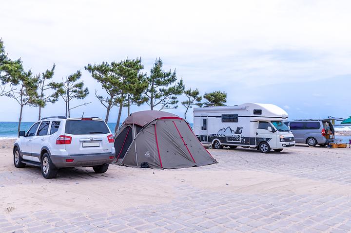 화진해수욕장 카라반은 경북 포항시 북구에 자리했다. 포항시청을 기점으로 31Km가량 떨어졌다. 자동차를 타고 희망대로, 영일만대로, 동해대로를 차례로 거치면 닿는다. 도착까지 걸리는 시간은 35분 안팎이다. 이 캠핑장은 입장료나 이용료가 없는 노지 캠핑장으로 크게 두 구역으로 나뉜다. 블록이 깔린 구역은 주로 카라반, 송림숲은 일반 캠퍼가 이용한다.