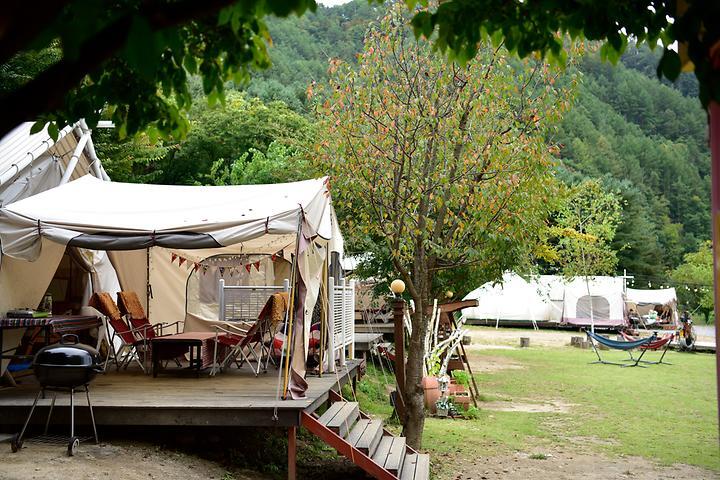 캠핑장은 글램핑 사이트 9개동(5m×10m)이 천연잔디 광장을 품고 어우러져 있다. 바로 앞에는 가평천이 흐르고 있어 탁 트인 전망을 선사한다. 이곳 캠핑장은 글램핑 사이트 외에도 펜션을 함께 운영 중으로 예전에는 이름을 날리던 펜션이라고 한다. 그만큼 시설도 신경을 썼는지 상당히 고급스런 느낌이다. 사이트간의 가리도 적당히 멀고 전용데크에는 나무가 사이트를 덥고 있어 천연 타프 역할을 한다. 카바나식 글램핑과 티피텐트형 사이트으로 구분되어 있어 각 이용자의 취향에 맞게 선택을 할 수 가있다. 이 캠핑장의 장점인 천연 그라운드를 이용하여 작은 음악회를 위한 라이브 무대가 설치되어 있는 모습이 마치 가평 자라섬에서 열리는 재즈페스티벌의 무대인 것처럼 느껴진다. 최근에는 정크아트로 유명한 작가님의 작품들을 캠핑장내 곳곳에 설치하여 이용고객들은 무료관람이 가능해 기념사진을 남기기에 좋은 장소이다. 수량이 풍부한 맑은 물이 흐르는 가평천이 있어 캠핑과 물놀이를 겸해서 할 수 있다.