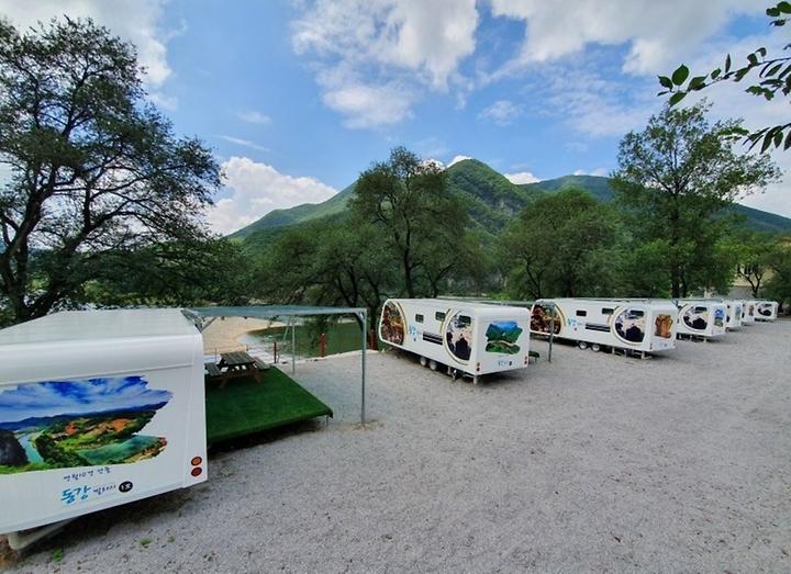 영월 동강가는 길에 있다. 어라연 가기전 동강오토캠핑장 앞쪽에 자리잡은 카라반캠핑장이다. 오래전부터 펜션과 식당, 매점으로 동강으로 가는 길의 휴게소 역할을 했던 동강빌리지에서 새롭게 개장한 카라반으로 펜션옆 강변을 따라 조성되어 있다. 때문에 모든 카라반 침대에서 동강의 절경이 바라다 보인다. 특히 캠핑장 바로 뒤쪽이 동강에서도 아름답기로 소문난 둥글바위가 있어 최고의 경관을 자랑한다.