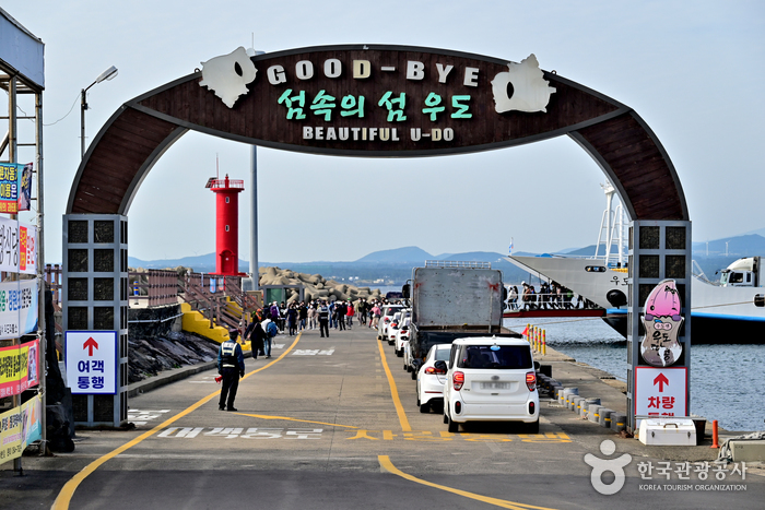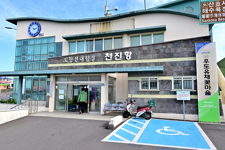 제주도의 동쪽 끝에 있는 우도는 물소가 머리를 내민 모양(우두형)으로 있는 것 같다고 해서 붙여진 이름이다. 서울 면적의 약 100분의 1이며, 인구가 1,800여 명 정도 되는 제주도의 섬이다. 우도에는 2개의 선착장 천진항과 하우목동항이 있는데 우도의 관문 항구이자 관광객들에게 많이 알려진 곳은 천진항이다. 우도 유채꽃 마을 정보 센터와 바로 붙어있는 우도 천진항 대합실은 크지 않은 규모로 매표소와 대기석 그리고 간단한 간식과 기념품을 구매할 수 있는 매점이 있다. 대합실 근처에는 우도 관광의 편의를 위해 전기자동차 대여소들이 즐비해 있다. 우도로 들어올 때는 자동차와 스쿠터를 가지고 들어올 수 있다. 자동차는 선적증 구입 후 출항 시간 10분 전까지 선원의 지시에 따라 반드시 면허증 소유자가 선적시켜야 한다.