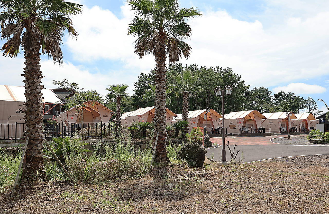 야자수와 수영장, 이국적인 풍광을 즐기는 제주 애월 글램핑장 제주 애월 소길리에 위치한 글램핑장이다. 애월 중산간에 위치해 조용하고 아름다운 뷰를 즐길 수 있다. 수영장과 물놀이 튜브, 편하게 쉴 수 있는 벤치와 썬베드, 아이들과 즐길 수 있는 놀이장, 넓은 캠핑장은 아이들과 가족들과 함께 제주에서의 캠핑을 즐기기에 더할나위 없다.