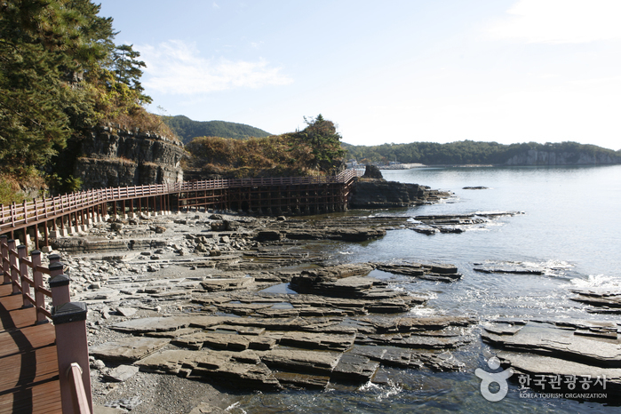 청소년수련원 앞 해수욕장에는 상시 조수에 씻겨 닳을대로 닳은 조약돌이 깔려있고 공룡발자국이 있는 넓은 암반을 지나면 산 전면이 층암단애 (층층이 깎아지른 듯한 절벽)로 되어있다. 또한 암벽 깊숙히 동서로 되돌아 돌며 암굴이 뚫어져 있는 것이 밥상다리 모양 같다하여 "상족", 여러 개의 다리모양 같다 하여 "쌍족" 또는 "쌍발이"라고도 불리고 있다. 암굴로 형성된 상족암은 높고 낮으며, 넓고 좁은 굴 안에는 기묘한 형태의 돌들이 많은 전설을 담고 있다.