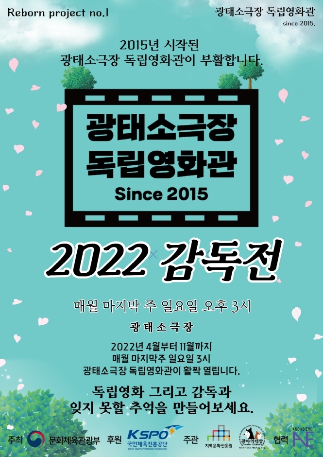 2022 감독전은 2015년 시작됐다 잠시 문을 닫았던 광태소극장 독립영화관이 다시금 문을 활짝 열었음을 알리는 Reborn Project이다. 본 프로젝트는 <2022 생활문화공동체 활성화 사업>의 일환으로 문화체육관광부가 주최 및 국민체육진흥공단의 후원을 받아 지역문화진흥원과 광야의태양Company가 주관하며 ㈜ 앤노엔이 협력하는 사업이다. 4월 부터 11월까지 매월 마지막 주 일요일 오후 3시에 이루어지며 독립영화도 보고 감독과 이야기도 나누고 관람객들과 네트워킹도 하는 다양한 커뮤니티를 형성할 수 있는 프로그램이다.